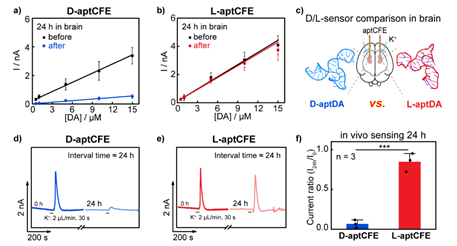 Long-term in vivo neurochemical sensing with aptamer-based electrochemical sensors is fundamentally limited by the enzymatic degradation of natural D-DNA aptamers and the instability of surface-confined sensing interfaces. Professor Jiang‘s team generate a mirror-image L-DNA analogue of a dopamine-binding aptamer and show that chiral inversion preserves folding, affinity, and selectivity, as confirmed by circular dichroism, fluorescence binding assays, and molecular docking. Integration of this L-aptamer with a stabilized electrochemical conjugation on carbon–fiber microelectrodes yields a highly stable mirror-image molecular–electrical interface capable of sensitively transducing dopamine binding into quantitative electrochemical signals. Owing to its exceptional nuclease resistance, the L-aptamer sensor enables continuous dopamine monitoring in vivo for over 24 h─an order-of-magnitude improvement in signal over conventional D-aptamer sensors. Applied in Parkinson’s disease mouse model, the sensor resolves pathological dopamine clearance defects. These results establish mirror-image nucleic acids, when coupled with engineered electrochemical interfaces, as effective components for durable bioelectronic sensing in vivo.
