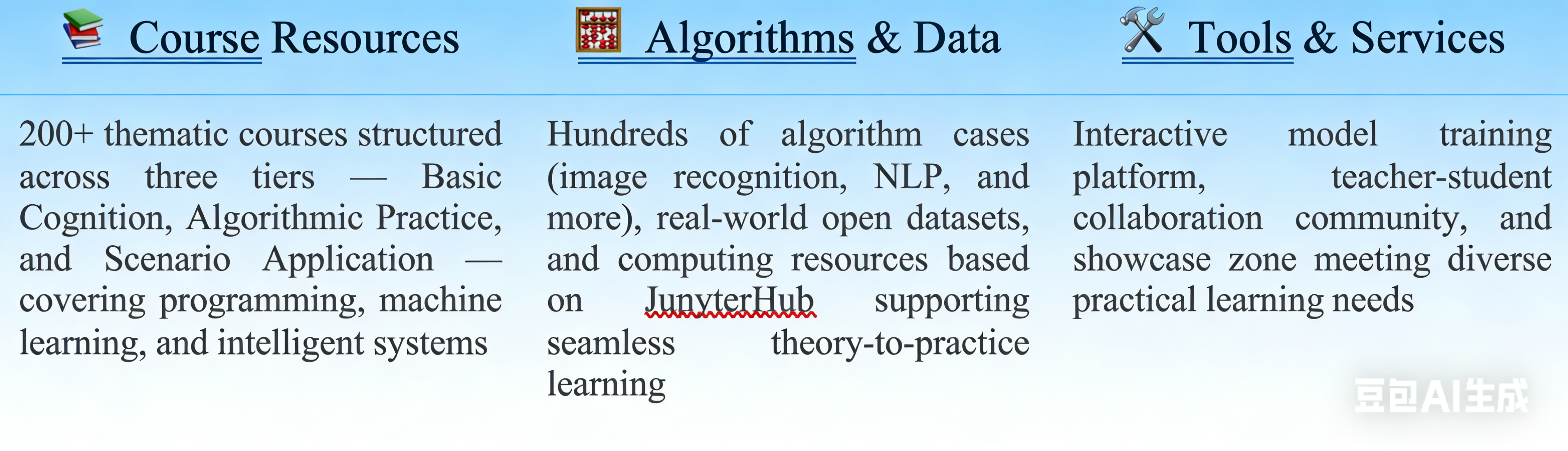 ■ Courses: Self-developed curricula spanning core AI knowledge and methods, designed using problem-based and project-driven pedagogical approaches. Expert lectures and enterprise case studies are integrated into large-scale blended online–offline courses, equipping students with a systematic knowledge architecture.