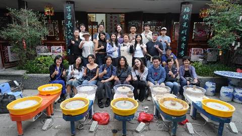 During the pottery experience session, under the guidance of master artisans, the teachers and students completed steps such as kneading clay and painting designs, combining their creativity with traditional Chinese patterns while experiencing Chinese ceramic culture.